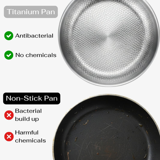 Unlike conventional non-stick pans that are coated with potentially harmful chemicals, this frying pan is crafted from pure titanium, ensuring durability and a safe cooking experience while providing exceptional non-stick properties through its unique design.